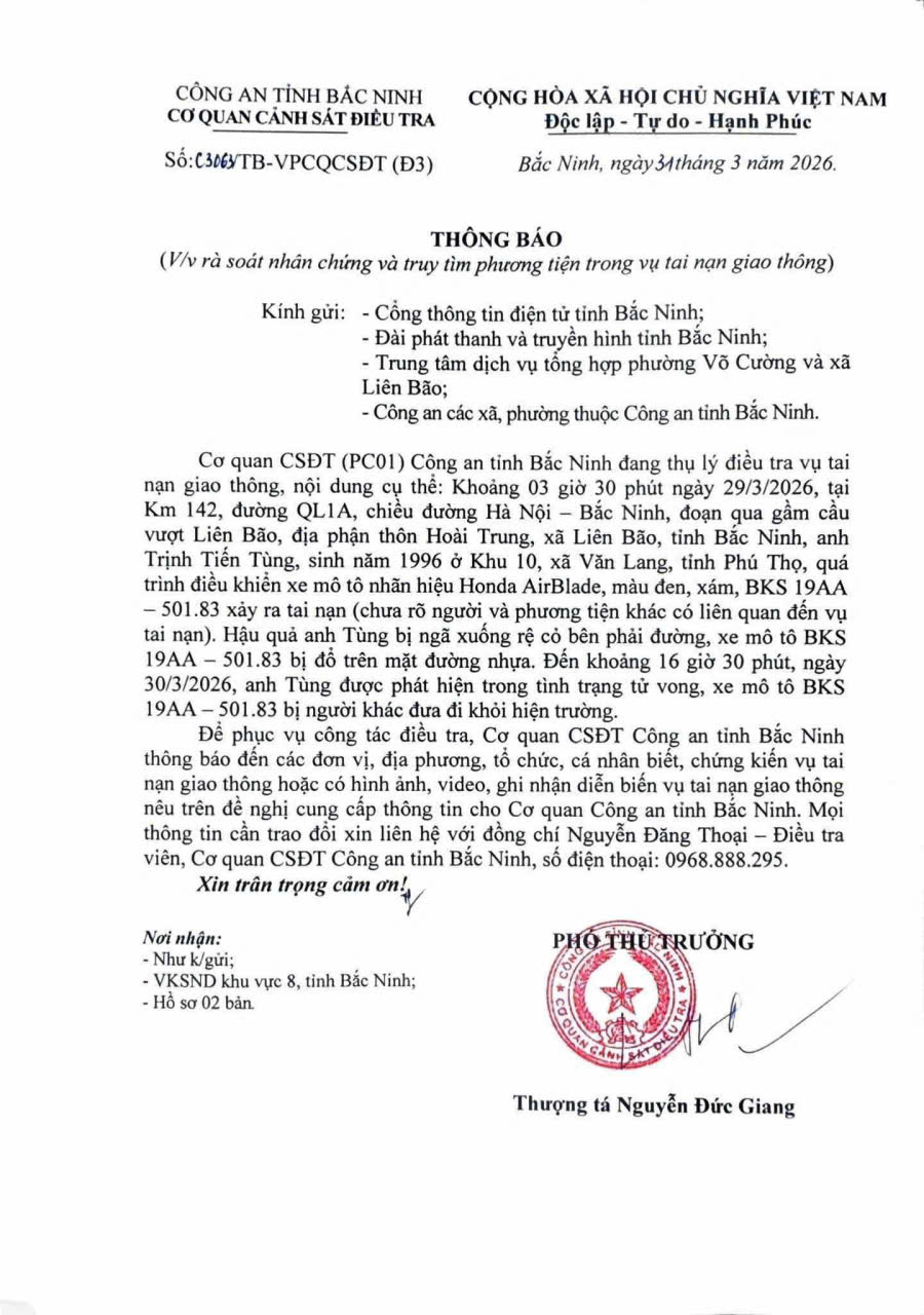 Hiện, Cơ quan Cảnh sát điều tra Công an tỉnh Bắc Ninh đang thụ lý điều tra vụ việc, đồng thời phát thông báo đề nghị các tổ chức, cá nhân nếu chứng kiến vụ tai nạn hoặc có hình ảnh, video ghi lại diễn biến liên quan, cung cấp cho cơ quan chức năng để phục vụ công tác điều tra.