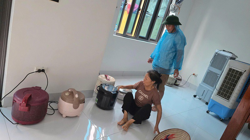 Bên trong căn nhà, khoảng chục chiếc nồi cơm điện đang bốc lên mùi cơm sôi thơm phức. Trên ghế, hàng loạt chiếc điện thoại đang sạc pin. Điện vẫn sáng bừng cả căn nhà.